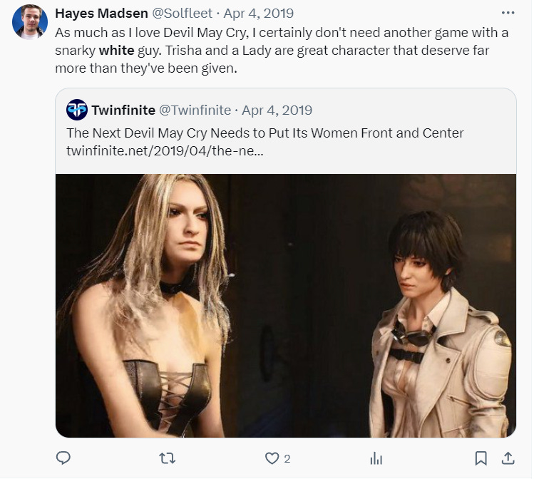 In April 2019, he posted, “As much as I love Devil May Cry, I certainly don't need another game with a snarky white guy. Trisha and a Lady are great character that deserve far more than they've been given.”