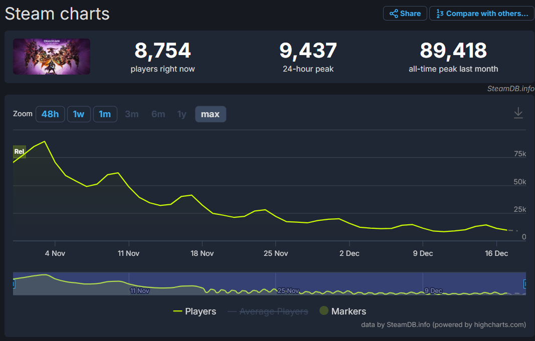Dragon Age: The Veilguard launched at the end of October and hit an all-time peak concurrent player count of just 89,418 on November 3rd. In the last 24-hours the peak concurrent player count only hit 9,437. That’s a decline of 89.4%.