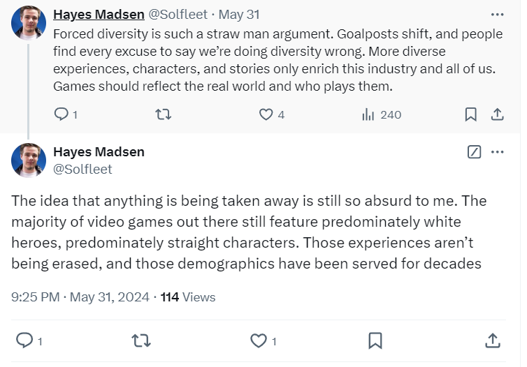 In May of this year, he wrote, “Forced diversity is such a straw man argument. Goalposts shift, and people find every excuse to say we’re doing diversity wrong. More diverse experiences, characters, and stories only enrich this industry and all of us. Games should reflect the real world and who plays them.”