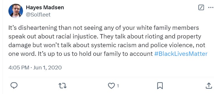 He wrote in 2020, “It’s disheartening than not seeing any of your white family members speak out about racial injustice. They talk about rioting and property damage but won’t talk about systemic racism and police violence, not one word. It’s up to us to hold our family to account #BlackLivesMatter.”