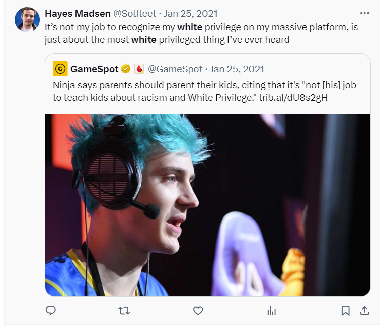 He also derided streamer Ninja in 2021 writing, “It’s not my job to recognize my white privilege on my massive platform, is just about the most white privileged thing I’ve ever heard.”