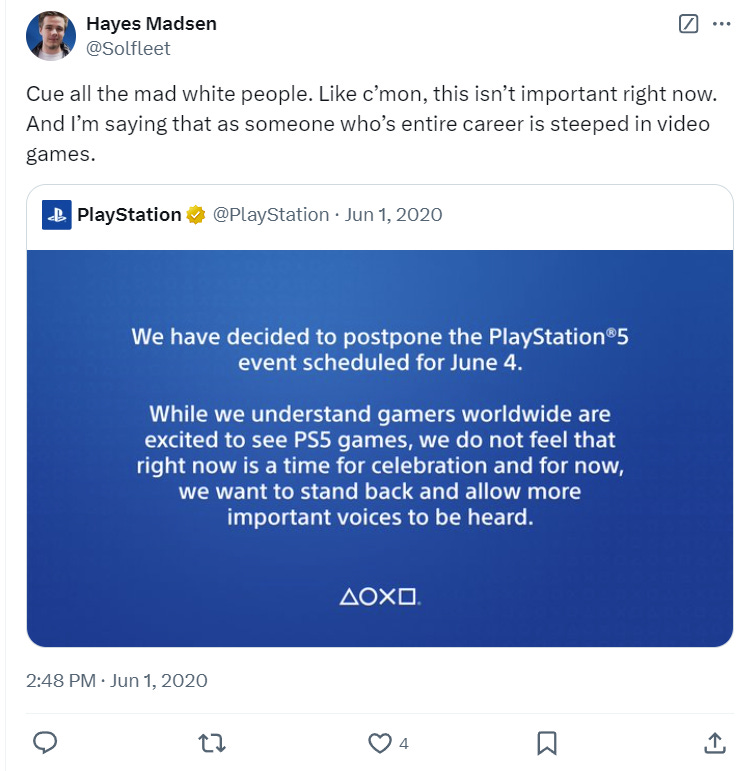 In June 2020, he reacted to PlayStation postponing a PlayStation 5 event writing, “Cue all the mad white people. Like c’mon, this isn’t important right now. And I’m saying that as someone who’s entire career is steeped in video games.”