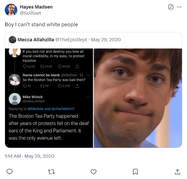 In May 2020, in response to one individual decrying the Black Lives Matter riots he wrote, “Boy I can’t stand white people.”