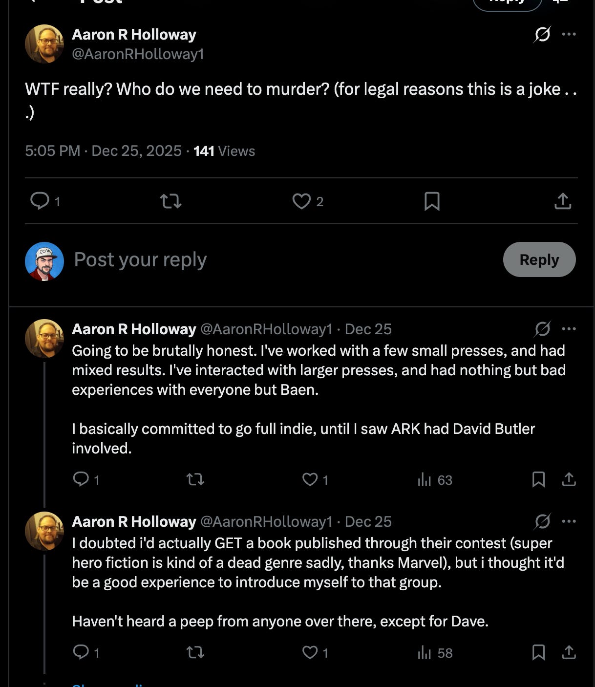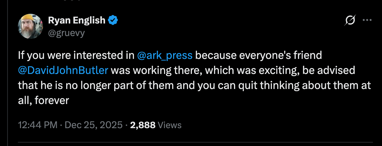 It looks like Butler is attempting to get ahead of the damage and yet virtue signal that he’s still supporting the company even though he’s been let go. His friends on X are not so forgiving of Ark Press, however.