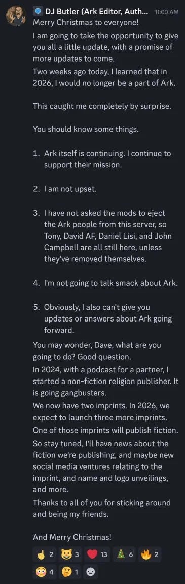 Ark Press has not made any public announcements about the matter itself and has been fairly quiet for the last couple of weeks. The X account has said little other than a couple of retweets of people posting they bought American Paladin, and no one seems to be doing much with the account that used to be fairly active when Butler was running it.