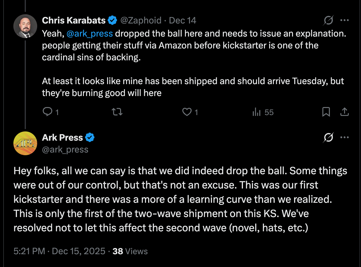 One might note another issue that around the time of Butler’s firing, fans were complaining on X that the American Paladin graphic novel got out to Amazon purchasers before those who backed on Kickstarter received it. There, they admitted they dropped the ball.