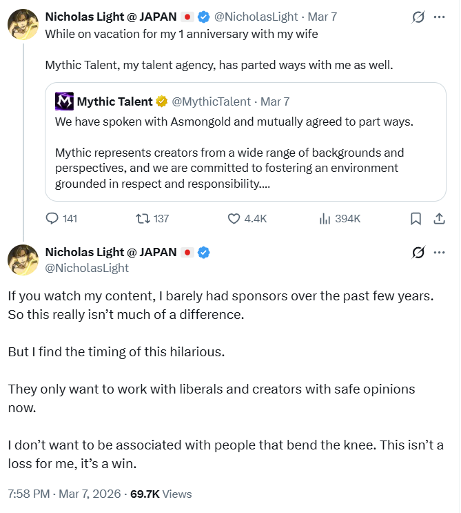 Asmongold was not the only one to split with Mythic Talent. Nicholas Light also indicated he was as well. He posted on X, “While on vacation for my 1 anniversary with my wife. Mythic Talent, my talent agency, has parted ways with me as well.”
