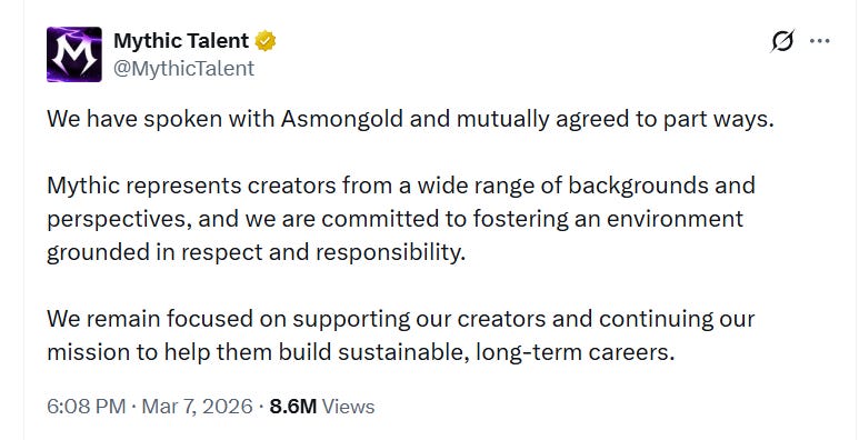 Mythic Talent first announced the split over the weekend on March 7th. The company stated, “We have spoken with Asmongold and mutually agreed to part ways.”