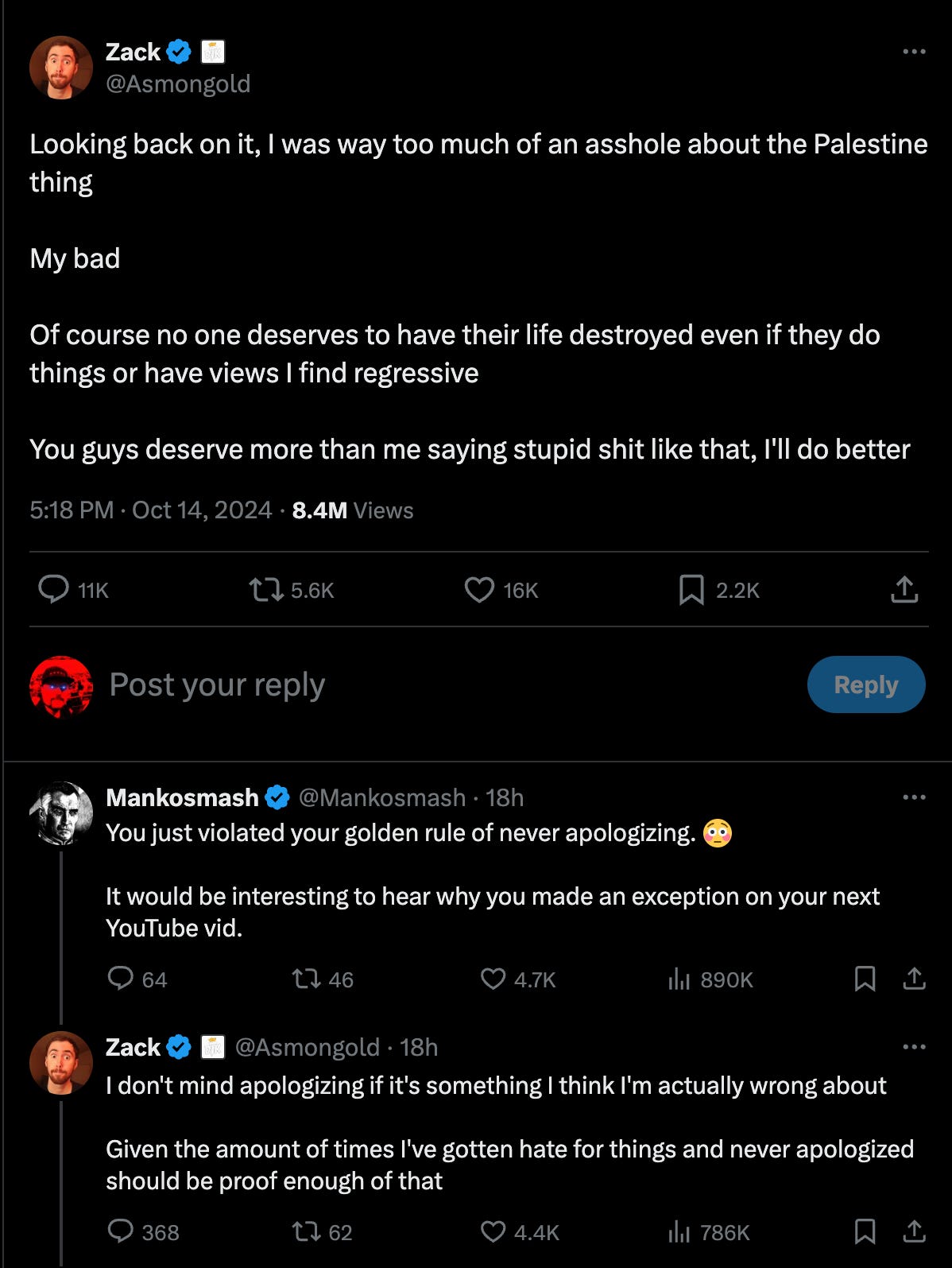 Sadly, Asmongold took to X to apologize, “ Looking back on it, I was way too much of an asshole about the Palestine thing. My bad. Of course no one deserves to have their life destroyed even if they do things or have views I find regressive You guys deserve more than me saying stupid shit like that, I'll do better.”