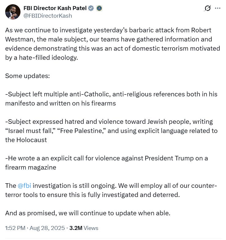 Following the shooting on August 27th, FBI Director Kash Patel shared an update on social media. He wrote, “As we continue to investigate yesterday’s barbaric attack from Robert Westman, the male subject, our teams have gathered information and evidence demonstrating this was an act of domestic terrorism motivated by a hate-filled ideology.”