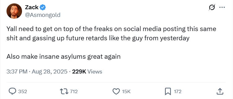 In response to this update from Patel, Asmongold wrote, “Yall need to get on top of the freaks on social media posting this same shit and gassing up future retards like the guy from yesterday.”