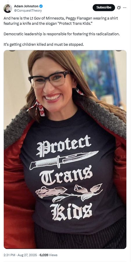 After listening to this, he then appeared to backtrack and say, “It’s a big problem. It’s a huge problem. And the thing is that it’s socially acceptable for people like this.” From there he pointed to the Lieutenant Governor of Minnesota wearing a shirt reading “Protect Trans Kids” with a knife on it.