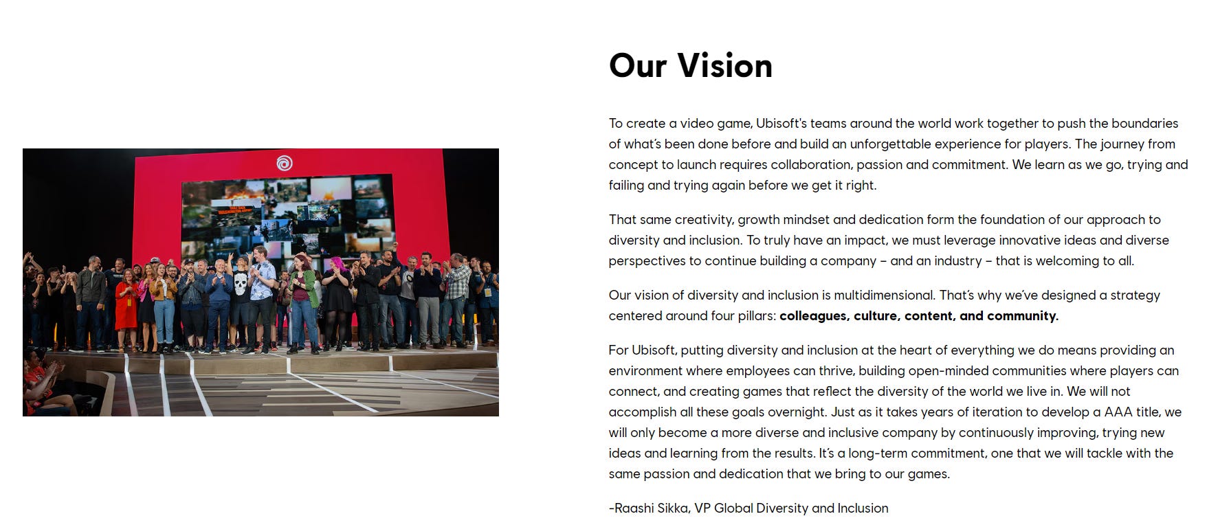 Sikka writes on the company’s Diversity, Inclusion, and Accessibility page of its website, “For Ubisoft, putting diversity and inclusion at the heart of everything we do means providing an environment where employees can thrive, building open-minded communities where players can connect, and creating games that reflect the diversity of the world we live in.”