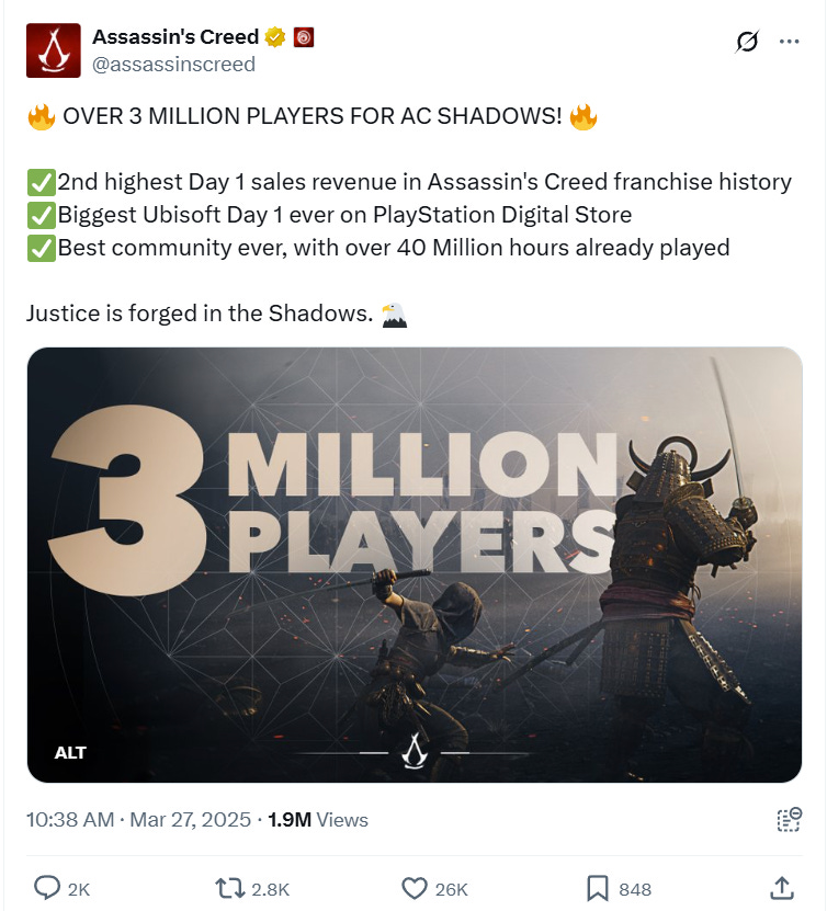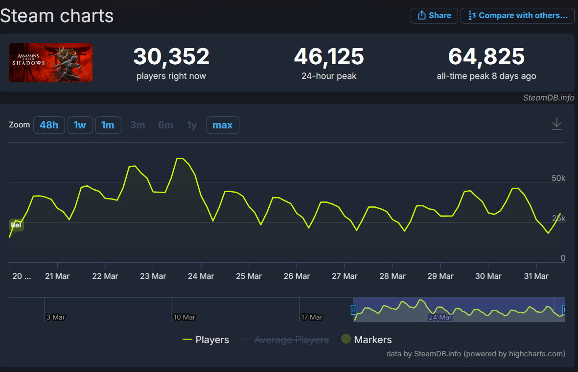 In its most recent 24-hour peak on Steam, Assassin’s Creed Shadows only hit 46,125 players. That’s a 28.8% decline from the game’s peak concurrent player count of 64,825, which it hit on Sunday, March 23rd, the first Sunday following the game’s release.