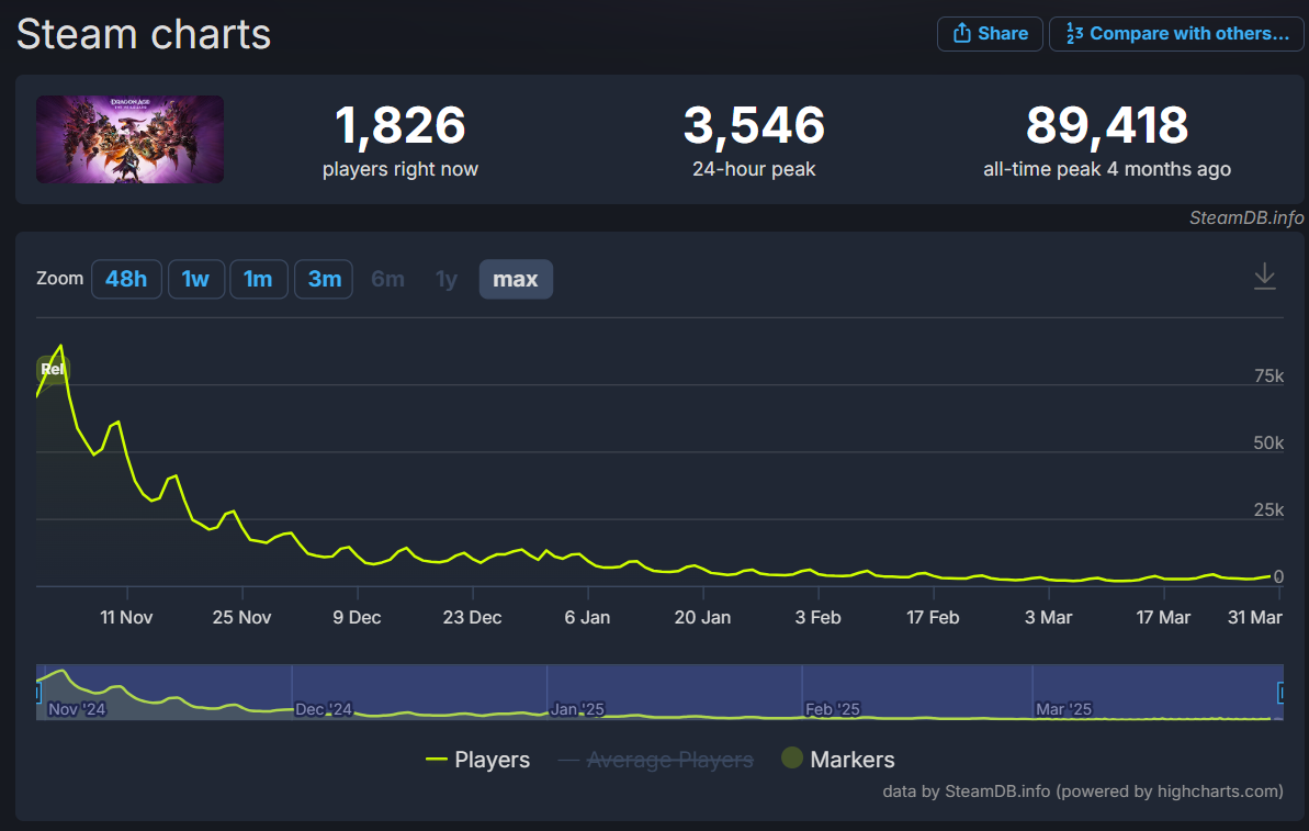 For comparison, Dragon Age: The Veilguard hit a peak concurrent player count of 89,418 players in its first Sunday, November 3rd. In its second Sunday, the game fell to a peak of 61,063. That was 31.7%.