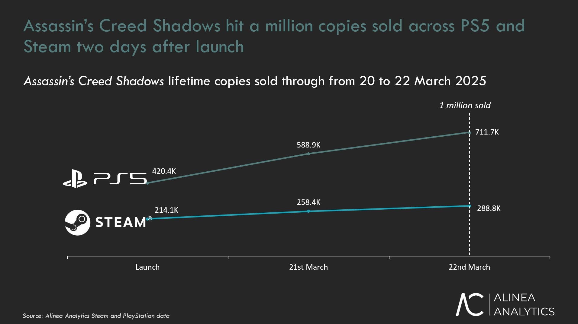 To highlight that, analyst Rhys Elliott shared data from Alinea Analytics that indicated the game had only sold about a million copies total between Steam and PlayStation by March 22nd.