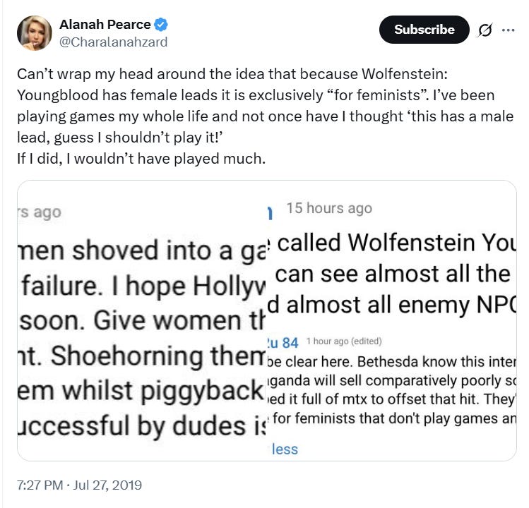 Pearce has also attempted to mock complaints about feminism being injected into video games. She mocked individuals noticing intersectional feminist propaganda in video games writing on X in 2019, “Can’t wrap my head around the idea that because Wolfenstein: Youngblood has female leads it is exclusively “for feminists”. I’ve been playing games my whole life and not once have I thought ‘this has a male lead, guess I shouldn’t play it!’ If I did, I wouldn’t have played much.”