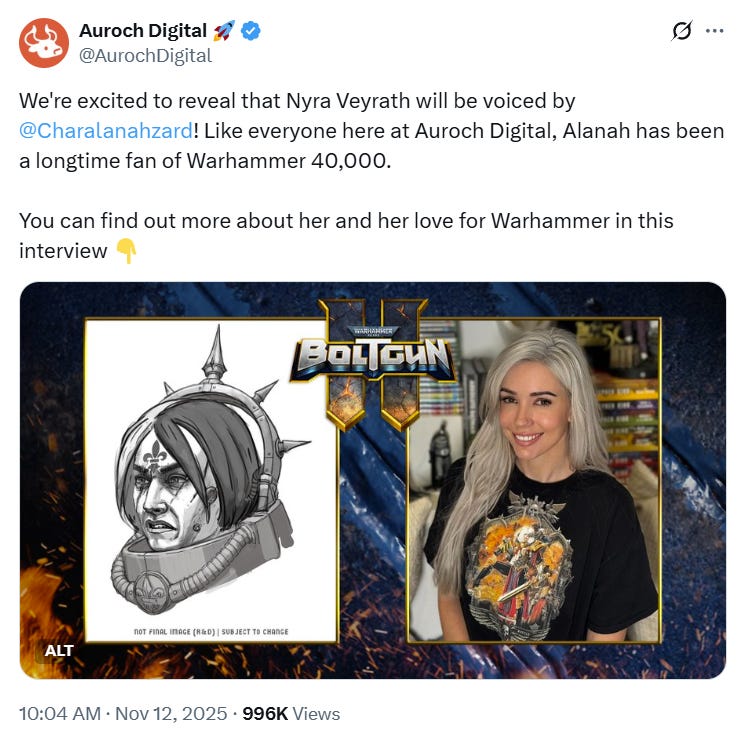 In a post to X the company announced, “We’re excited to reveal that Nyra Veyrath will be voiced by Alanah Pearce! Like everyone here at Auroch Digital, Alanah has been a longtime fan of Warhammer 40,000.”