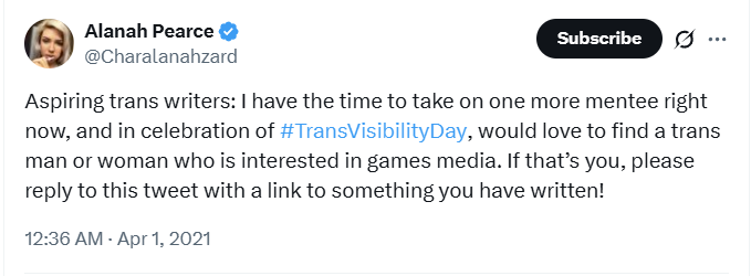 Earlier in 2021, she wrote, “Aspiring trans writers: I have the time to take on one more mentee right now, and in celebration of #TransVisibilityDay, would love to find a trans man or woman who is interested in games media. If that’s you, please reply to this tweet with a link to something you have written!”