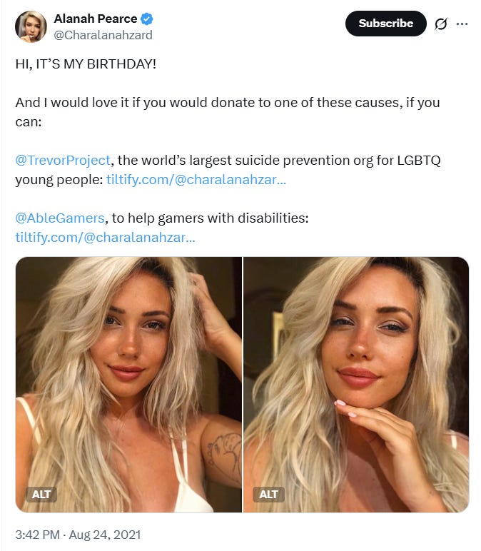 In 2021, she encouraged her followers to donate money to the pro-LGBTQ+ group The Trevor Project and Able Gamers Charity.