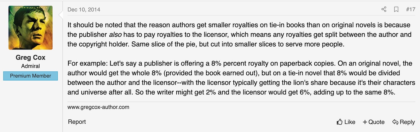 “For example: Let's say a publisher is offering a 8% percent royalty on paperback copies. On an original novel, the author would get the whole 8% (provided the book earned out), but on a tie-in novel that 8% would be divided between the author and the licensor--with the licensor typically getting the lion's share because it's their characters and universe after all. So the writer might get 2% and the licensor would get 6%, adding up to the same 8%.”