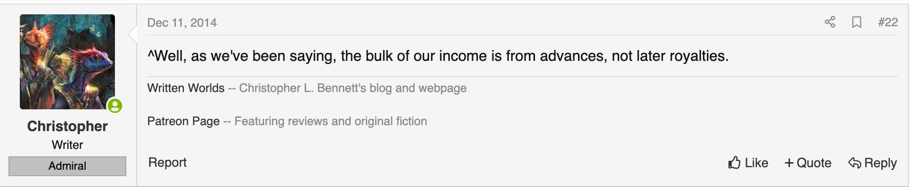 Christopher L. Bennett, another Star Trek author, pointed out they rarely get later royalties, saying, “^Well, as we've been saying, the bulk of our income is from advances, not later royalties.”