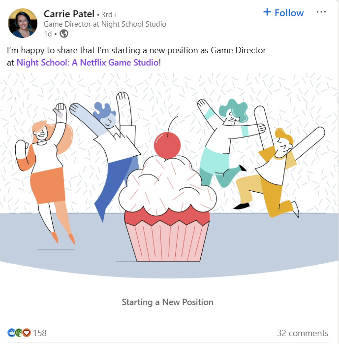 Patel announced she joined Netflix and its Night School: A Netflix Game Studio on LinkedIn. She wrote, “I’m happy to share that I’m starting a new position as Game Director at Night School: A Netflix Game Studio.”