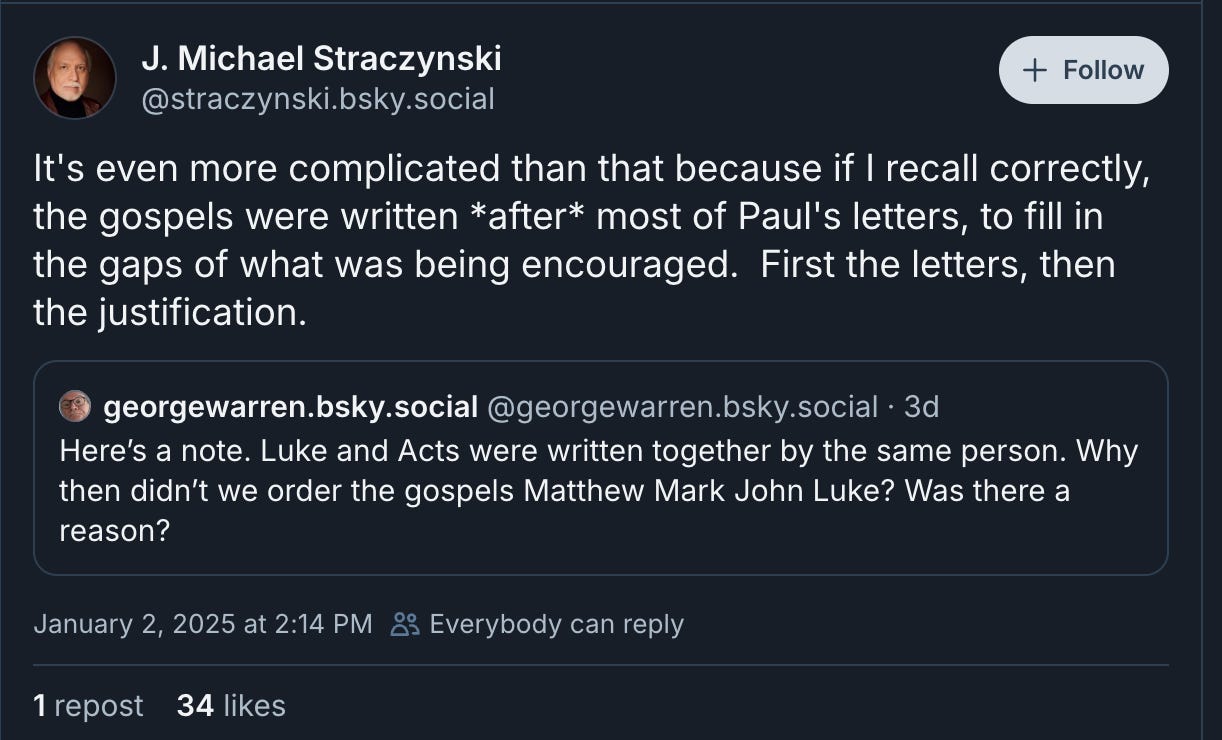 He then attacks the authenticity of the Gospels, saying, “It's even more complicated than that because if I recall correctly, the gospels were written *after* most of Paul's letters, to fill in the gaps of what was being encouraged. First the letters, then the justification.”