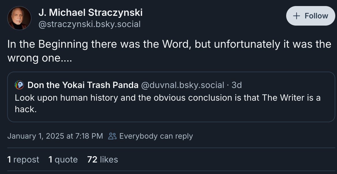 Straczynski followed this with a quote saying, “In the Beginning there was the Word, but unfortunately it was the wrong one....”
