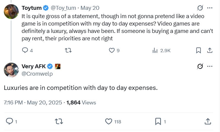 The individual also retorted, “It is quite gross of a statement, though im not gonna pretend like a video game is in competition with my day to day expenses? Video games are definitely a luxury, always have been. If someone is buying a game and can't pay rent, their priorities are not right.”