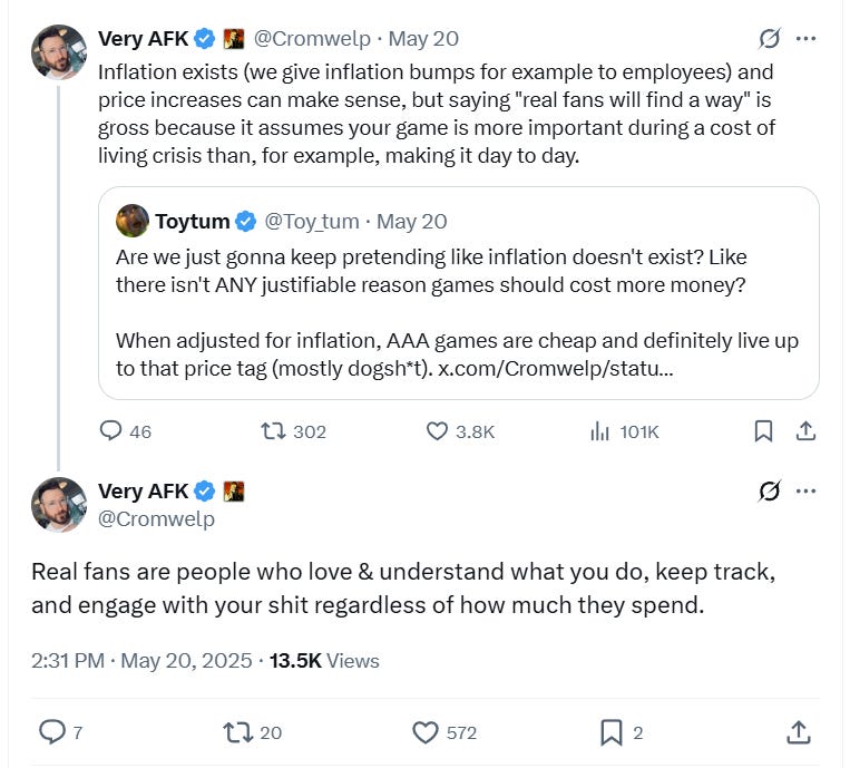 Douse then explained his comment, “Inflation exists (we give inflation bumps for example to employees) and price increases can make sense, but saying ‘real fans will find a way’ is gross because it assumes your game is more important during a cost of living crisis than, for example, making it day to day.”