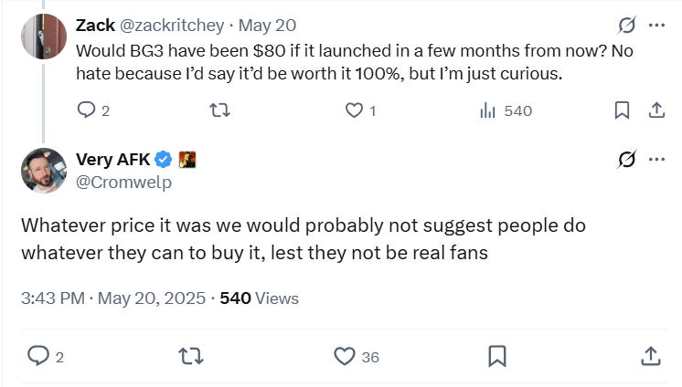 When questioned by another individual if Baldur’s Gate 3 would cost $80 if it launched a few months from now, Douse replied, “Whatever price it was we would probably not suggest people do whatever they can to buy it, lest they not be real fans.”
