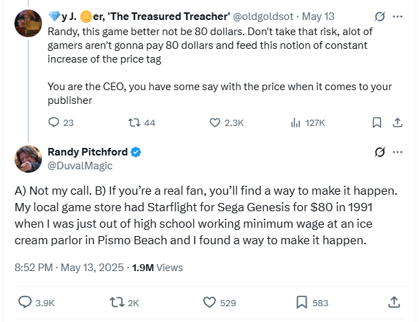 He wrote, “A) Not my call. B) If you’re a real fan, you’ll find a way to make it happen. My local game store had Starflight for Sega Genesis for $80 in 1991 when I was just out of high school working minimum wage at an ice cream parlor in Pismo Beach and I found a way to make it happen.”