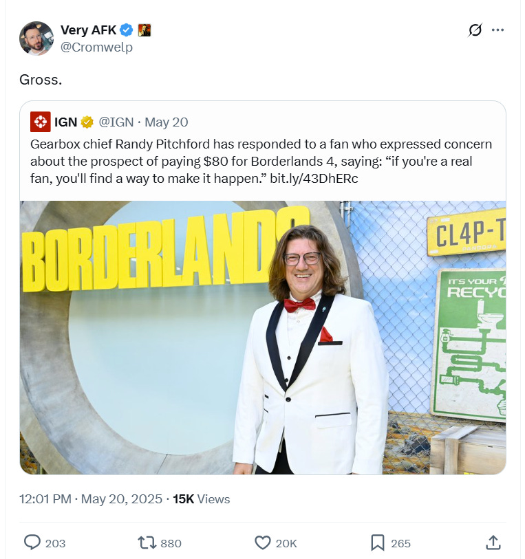 Back on May 13th, Pitchford replied to an individual expressing his hope that Borderlands 4 would not cost $80.