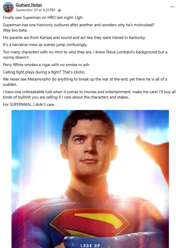 Nolan shared his thoughts on Gunn’s latest film writing on Facebook, “Superman has one histrionic outburst after another and wonders why he’s mistrusted? Way too beta.”