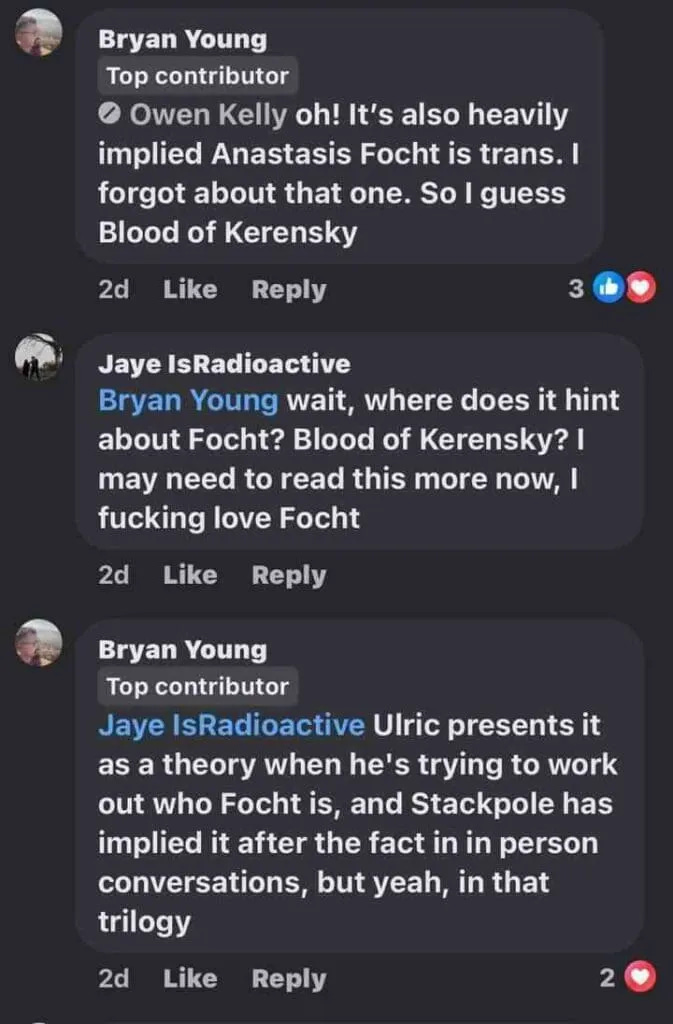 Bryan Young posted in a thread about the topic, saying, “Oh! It’s also heavily implied Anastasis Focht is trans. I forgot about that one. So I guess Blood of Kerensky.”