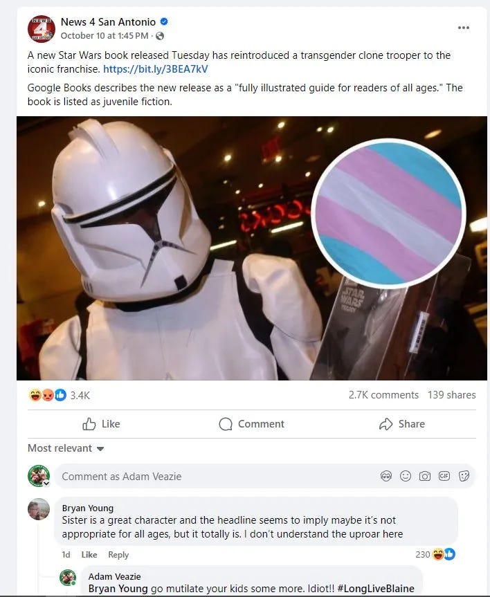 Bryan Young also voiced his approval of putting transgender clone troopers into Star Wars books when another controversy broke out about grooming children. “Sister is a great character and the headline seems to imply maybe it’s not appropriate for all ages, but it totally is. I don’t understand the uproar here.”