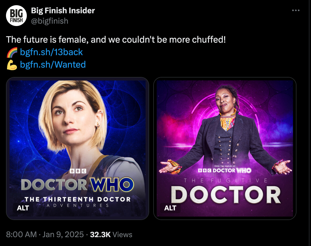 Most bizarre was their marketing effort on X, posting the links as well as covers for the audio dramas with the text, “The future is female, and we couldn't be more chuffed!”