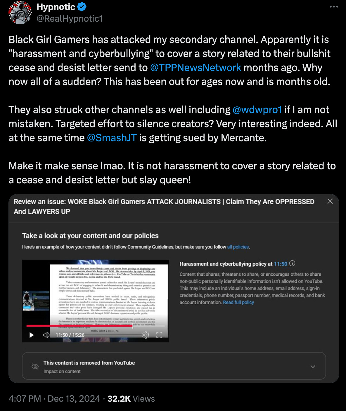 The grifting consultants also attacked popular video game analyst, Hypnotic. He posted, “Black Girl Gamers has attacked my secondary channel. Apparently it is "harassment and cyberbullying" to cover a story related to their bullshit cease and desist letter send to