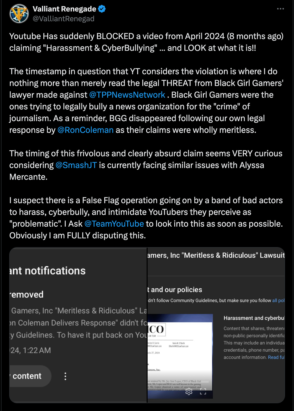 “The timestamp in question that YT considers the violation is where I do nothing more than merely read the legal THREAT from Black Girl Gamers' lawyer made against