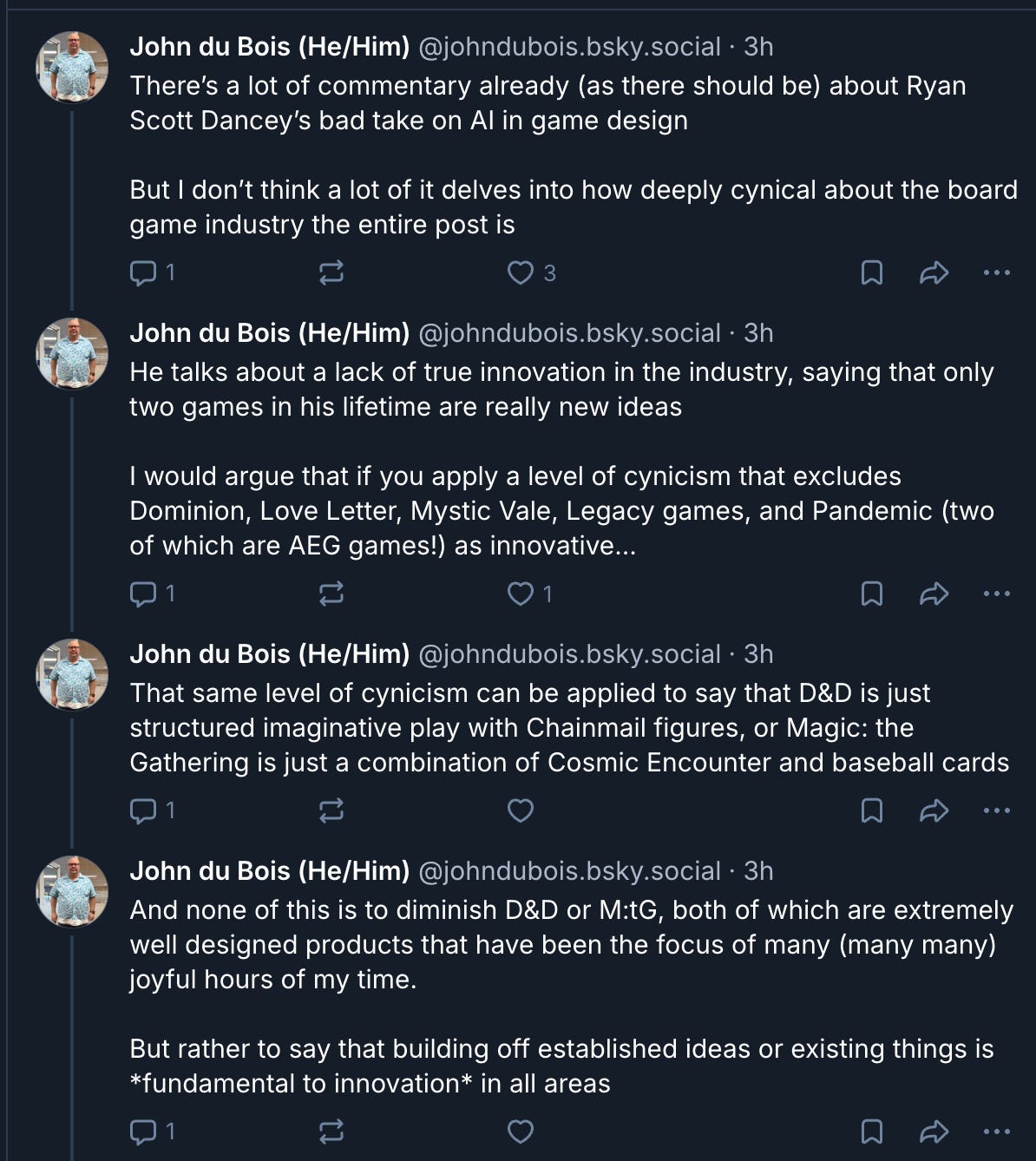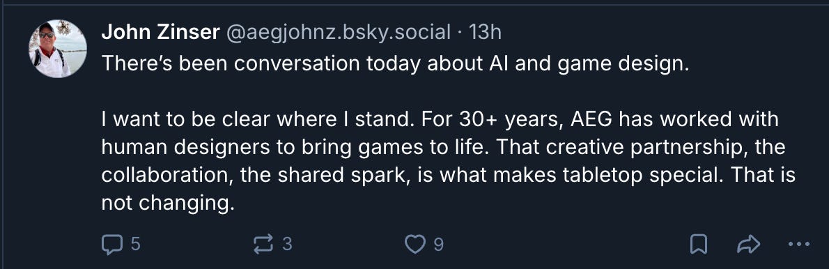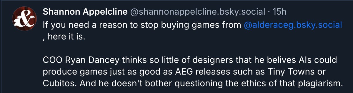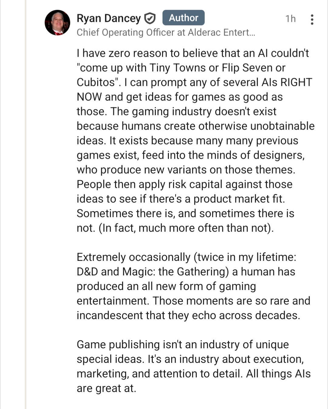 This prompted complete outrage from the board game industry, as the establishment in the creative arts publishing is supposed to all 100% oppose AI in some Don Quixote-level running at windmills exercise in futility, just so they can feel better about themselves.