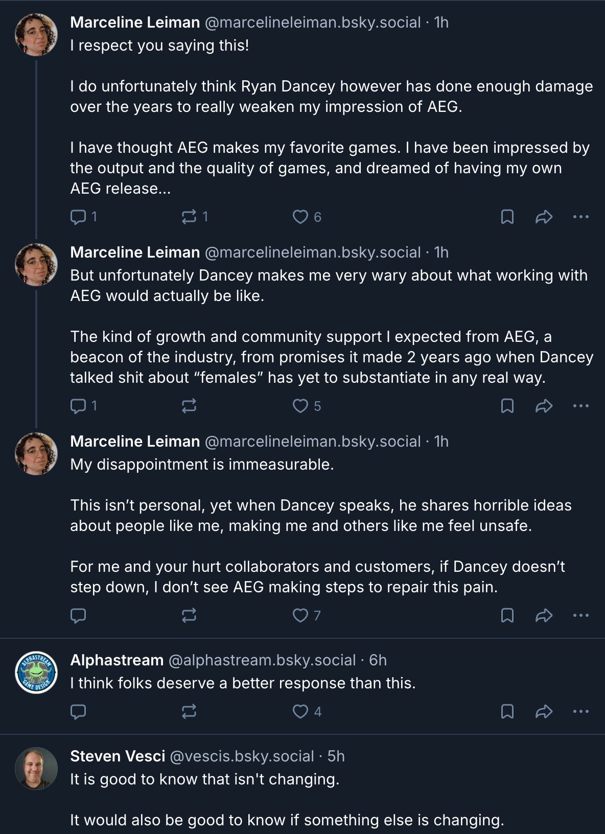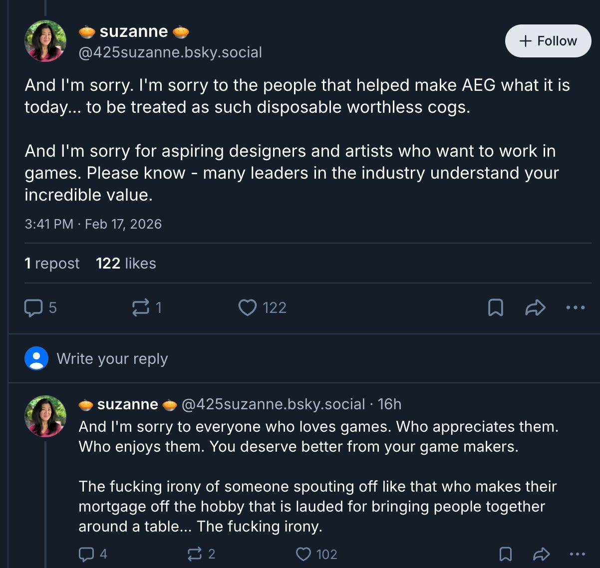 Suzanne, a former Dice Tower Contributor who’s been a massive proponent of cancel culture to the point of getting one of the largest retailers banned from Gencon out of personal animus, amplified the virtue signaling against AEG: