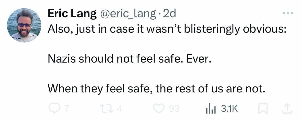 He’s prone to making rage-bait posts about Nazis, such as when he posted, “Also, just in case it wasn’t blisteringly obvious: Nazis should not feel safe. Ever. When they feel safe, the rest of us are not.”
