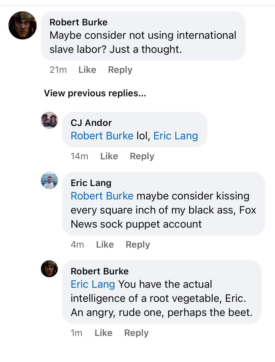 Lang was confronted about this post by The Silver River board game designer Robert Burke. Burke commented, “Maybe consider not using international slave labor? Just a thought.”
