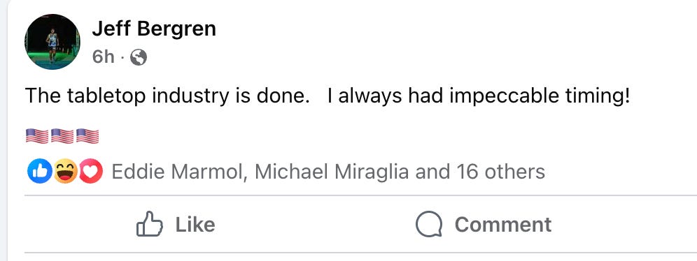 Jeff Bergen used to run the retail network TGG Games, but he sold the company and left the industry. He posted to Facebook, “The tabletop industry is done. I always had impeccable timing!”