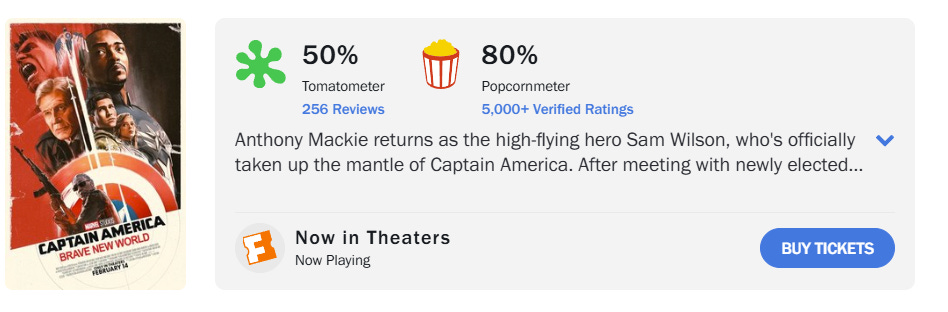 When looking at total tickets sold, OMB Reviews estimated that Captain America: Brave New World only sold 6,321,429 tickets.