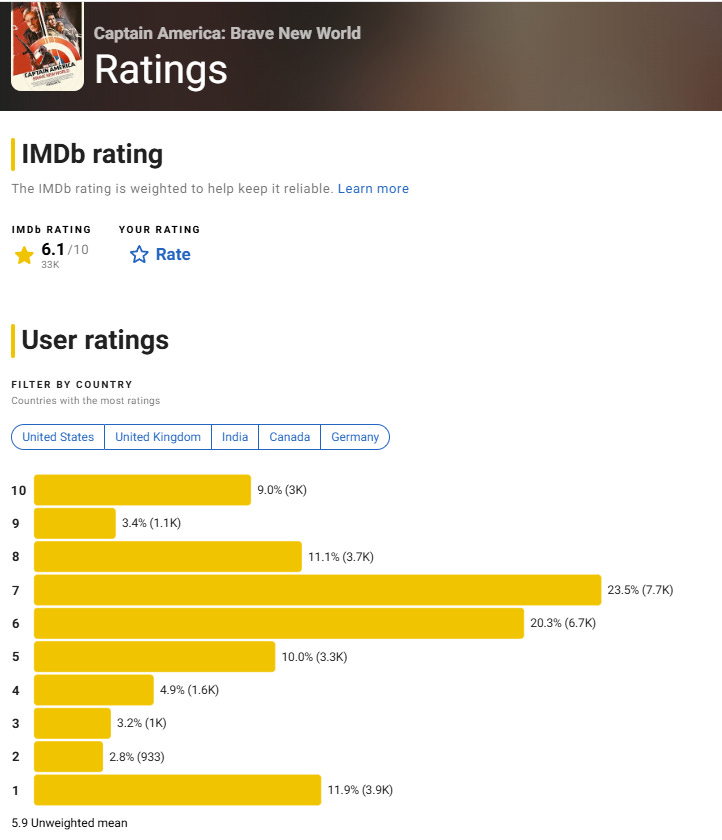 On IMDb, the film has a 6.1 out of 10 rating and an unweighted mean of 5.9 from 35,000 reviews.