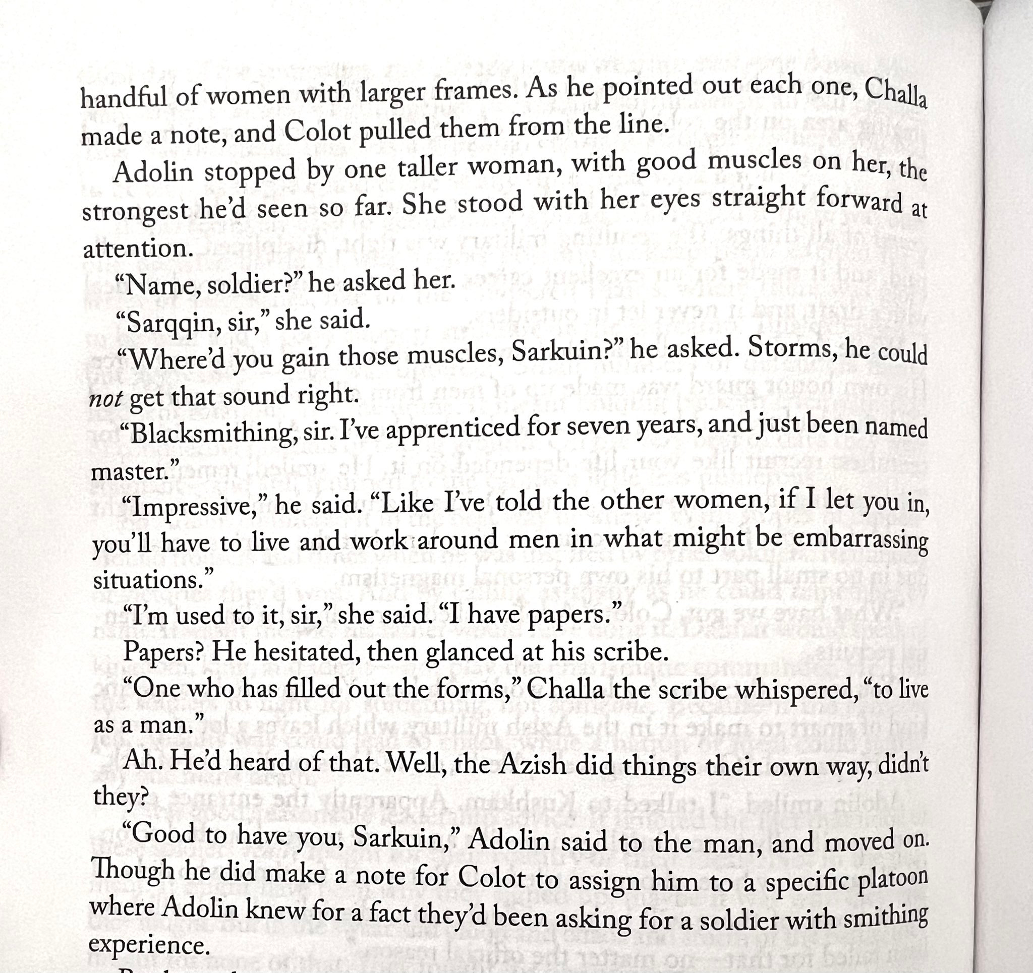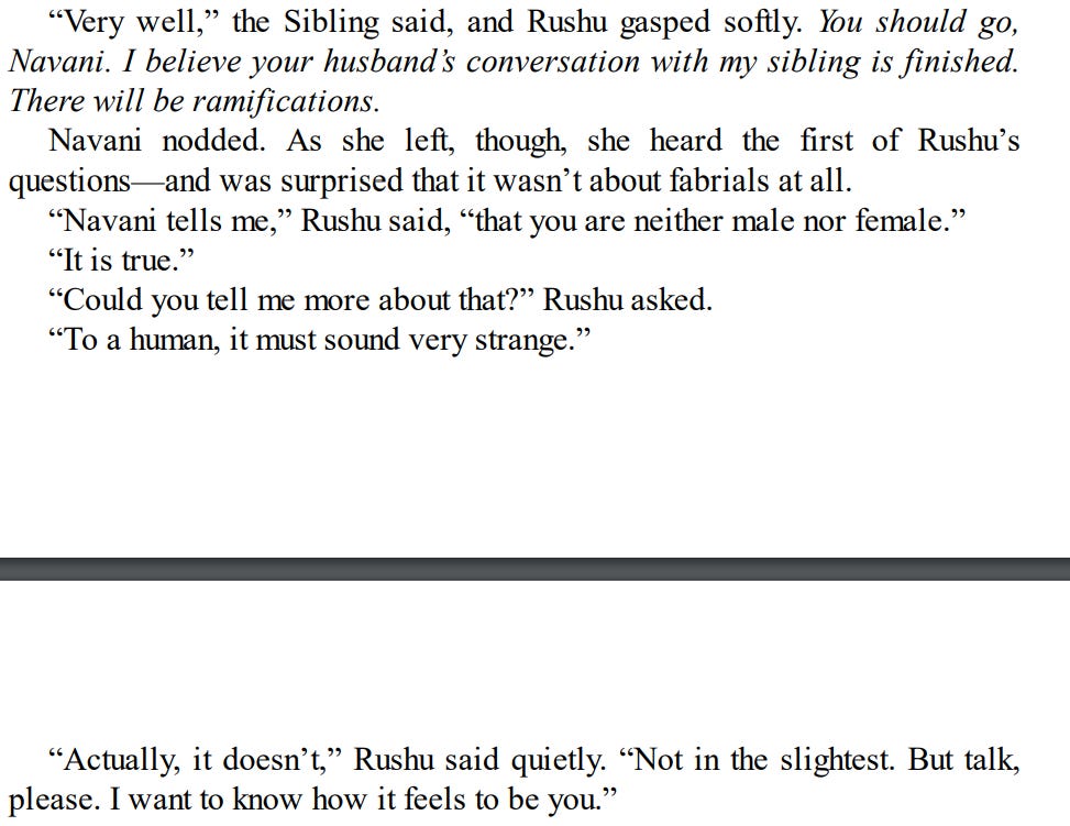 Another section reads, “‘Navani tells me,’ Rushu said, ‘ that you are neither male nor female.’ ‘It is true.’ ‘Could you tell me more about that?’” The passage is followed by a lecture on gender to humans.