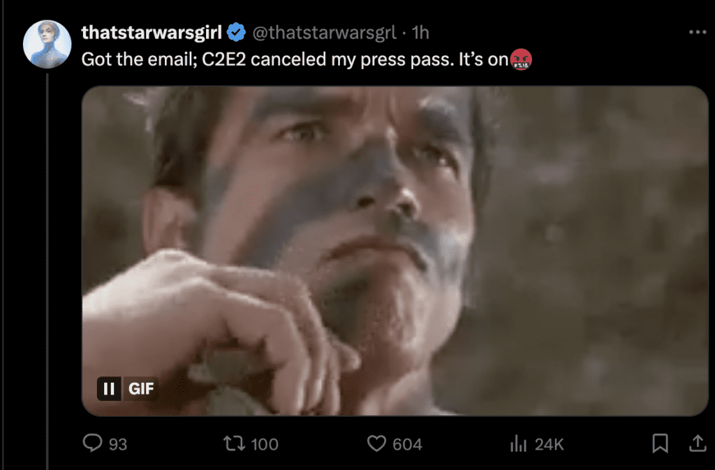 The political matters worsened as cultural commentator Anna, ThatStarWarsGirl, posted to Twitter / X stating that C2E2 removed her press pass just days after the situation with Ethan Van Sciver, Jon Malin, and Shane Davis.