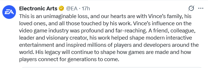 Vince was a titan and legend of this industry, a visionary leader and a force who shaped teams and games like Call of Duty, Titanfall, Apex Legends, the Star Wars Jedi series and Battlefield for our community in ways that will be felt for generations.